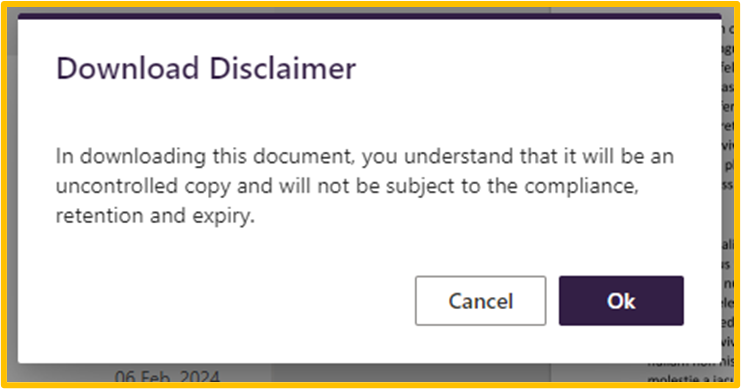 A download disclaimer message will appear warning users that files will not be subject to compliance, retention and expiry policies. Click ‘Ok’ to proceed with download.