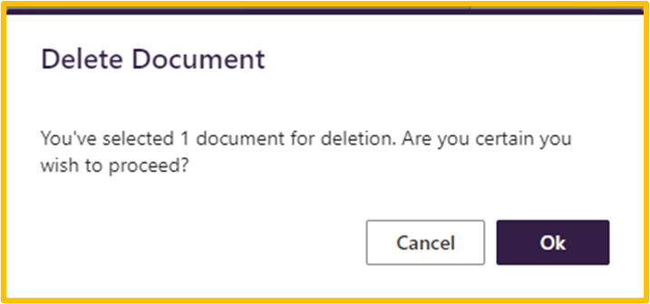 - A pop-up confirmation box will appear, stating the number of documents that have been selected for deletion and whether the user is certain to proceed with deleting the file from the record. If the user is certain, click the ‘Ok’ button.