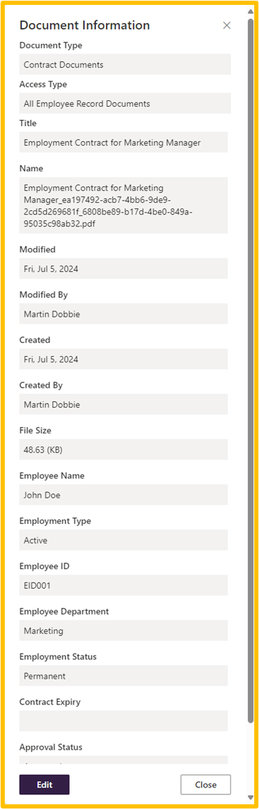 The document information panel will open where you view all properties. To edit the properties, click the ‘Edit’ button.