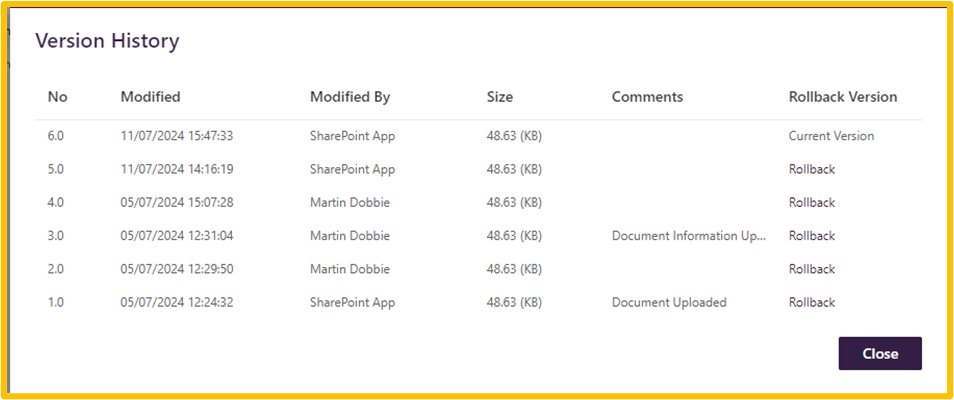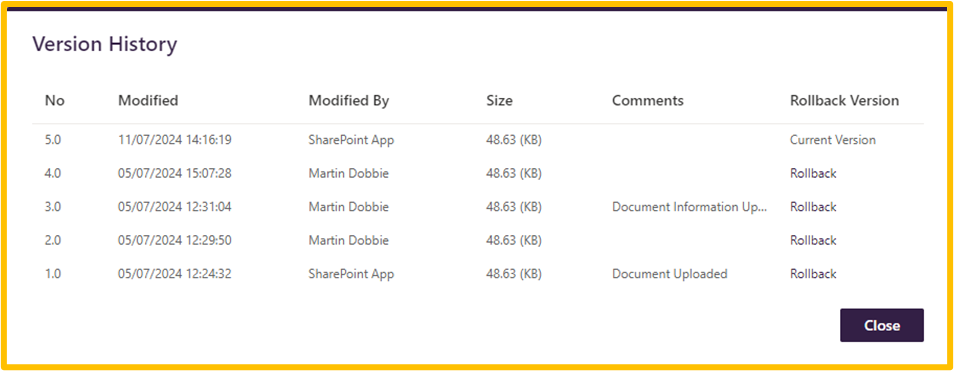 A pop-up box will appear displaying all versions of the document, with information about who modified the document and when it was modified. Users can restore a version of the document by clicking ‘Rollback’.